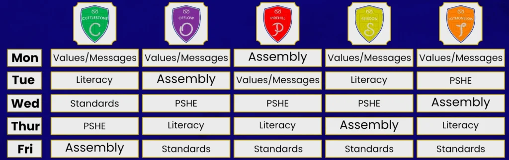 Each year group follows a programme of activities in tutor time. The overview can be seen below. On occasion, when there is a major event which occurs regionally, nationally or Internationally, it may be appropriate to suspend this timetable to respond and discuss something which has effected society, either a celebration or sometimes to help provide support with more difficult events.